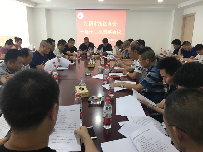 2017年7月28日下午,江阴市浙江商会一届十二次理事会议在商会会议室召开,会议由会长林维忠主持,原工商联副主席、特邀顾问朱顺清应邀出席会议。