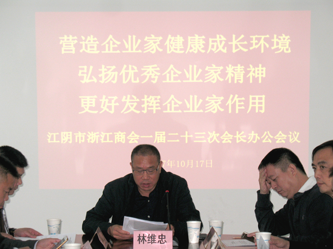 10月17日,江阴市浙江商会召开一届二十三次会长办公会议,学习领会《中共中央 国务院关于营造企业家健康成长环境弘扬优秀企业家精神更好发挥企业家作用的意见》精神,会议由会长林维忠主持。