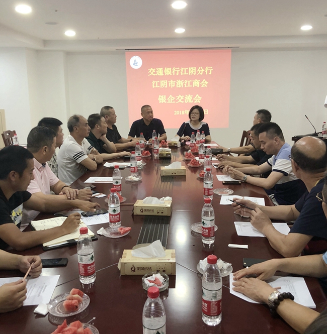办公会议随后,与交通银行江阴分行举行了银企交流座谈会。会上,会长林维忠介绍了商会基本情况,他表示,江阴浙江商会在实体经济、流通领域都有积极参与,对江阴经济和社会发展作出了应有的贡献。企业的发展离不开金融系统的支持,今天的活动对解决企业融资问题,资金盘活等意义很大。希望我们商会与交行之间合作共赢、互惠互利,广泛开展深层次的实质性合作,积极探索“银行+商会+企业”的运作平台,助推会员企业可持续、健康发展。