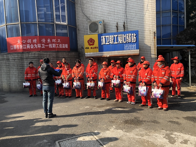 12月18日,江阴市浙江商会“爱心捐赠,情系环卫”为一线环卫职工送温暖活动走进了江阴市公用事业管理局,为全市1250名环卫职工送上价值6万元的热水袋、毛巾、洗衣粉、户外头巾等生活慰问品。
