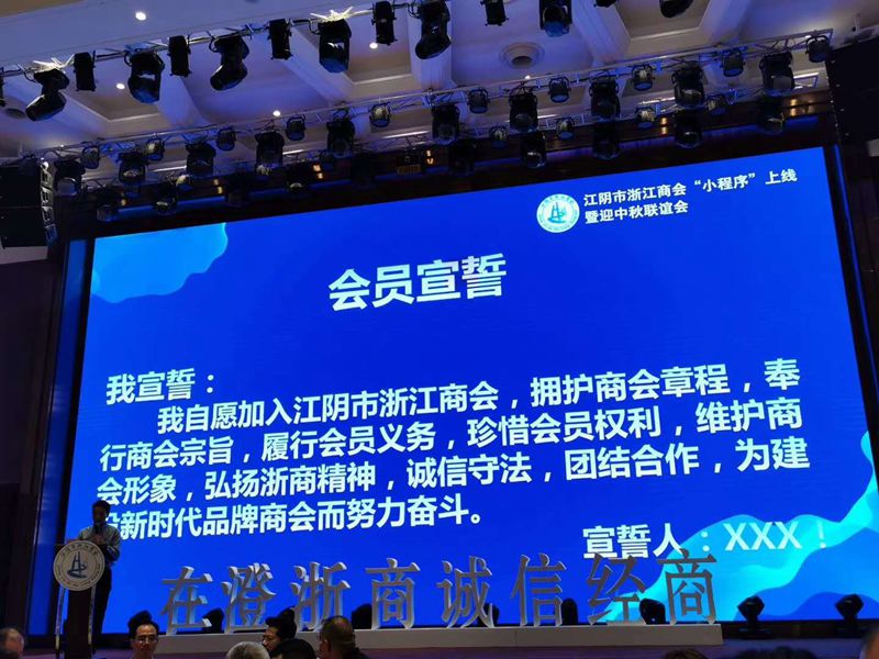 9月20日下午,江阴市浙江商会“小程序”服务平台上线暨迎中秋联谊会在恒记饭店隆重举行。江阴市浙江商会全体会员、江阴浙江联谊会成员、周边地区的浙江商会和江阴兄弟商会代表近200人参加会议。中共江阴市委副书记、统战部部长袁秋中,无锡市工商联副主席于建军,市委统战部副部长、市工商联党组书记陈雪源,市工商联副主席金锡妹,江苏省浙江商会副秘书长诸冠章等有关部门领导应邀参加。会议由副会长陈慧超主持。