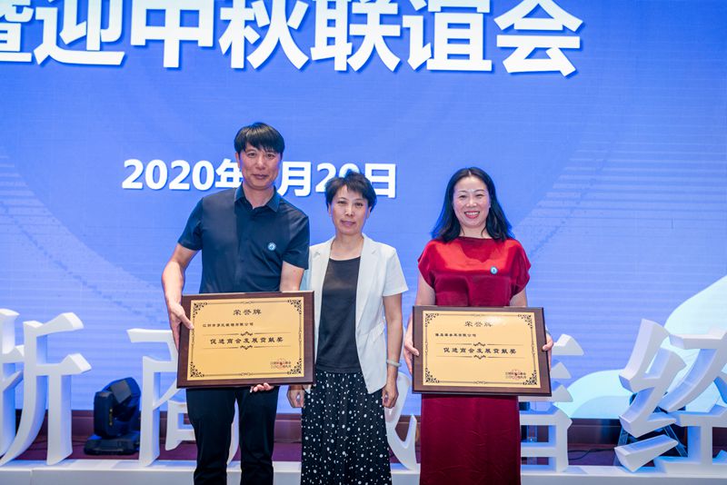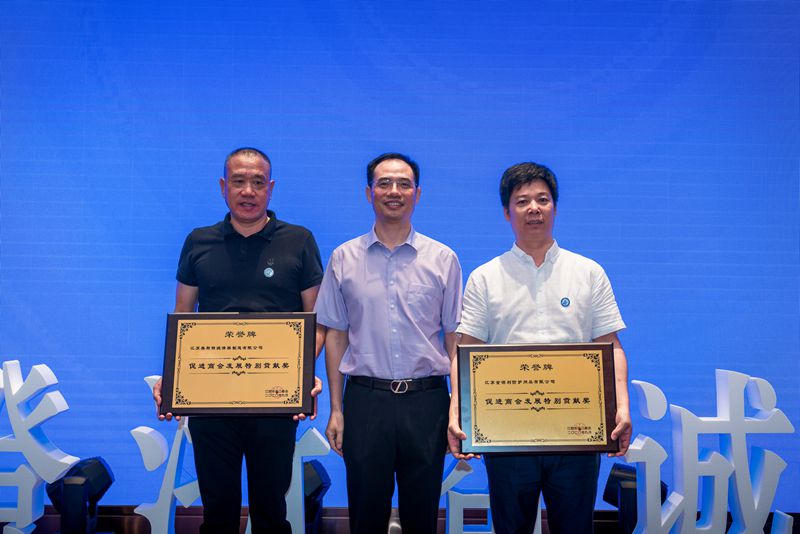 无锡市工商联副主席于建军、江阴市工商联副主席金锡妹分别为开发“小程序”服务平台作出贡献的江苏奥斯特滤清器制造有限公司、江苏金诺利防护用品有限公司、江阴市苏氏眼镜有限公司、江阴臻晟源参茸有限公司4家会员企业授荣誉牌。