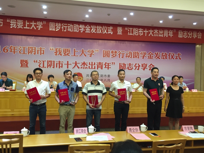 8月24日,共青团江阴市委举行2016年江阴市“我要上大学”圆梦行动助学金发放仪式,圆梦行动是支持家庭贫困、品学兼优的应届高中毕业生走进大学校园。江阴市浙江商会捐资18000元帮助6名贫困学子圆梦上大学,获得了2016年江阴市“‘我要上大学’圆梦行动特殊贡献奖”称号。 连续十二年,以强烈的责任感热心慈善,捐资助学已成为江阴市浙江商会参与公益事业的一个活动品牌。常务副会长杨小辉、副会长陈慧超代表商会参加了活动。