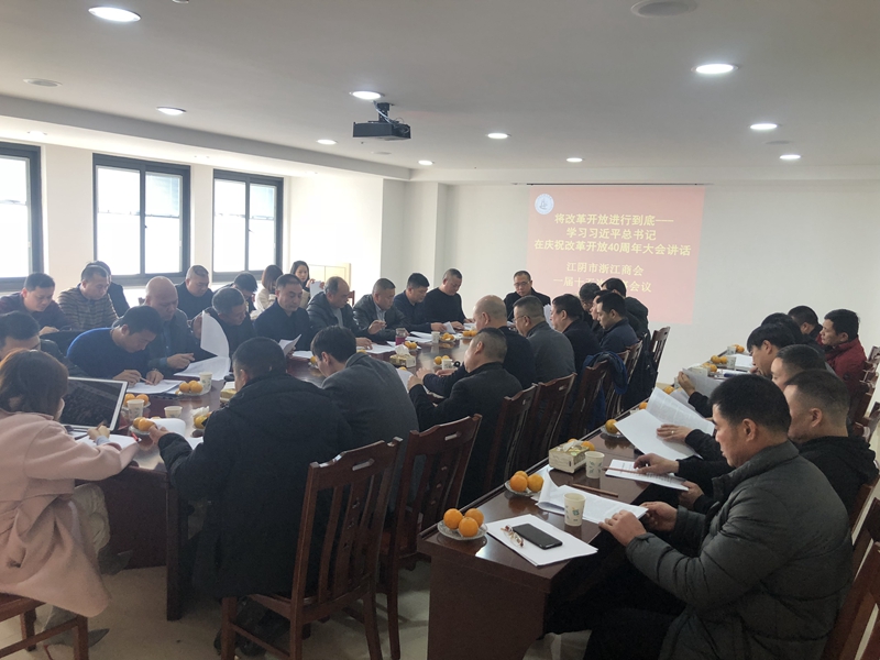 12月 20 日下午,江阴市浙江商会召开一届十五次理事会议,认真学习领会习近平总书记在庆祝改革开放40周年大会上的重要讲话精神,理事会成员近40人参加了会议,会长林维忠主持会议,商会顾问朱顺清应邀出席会议。